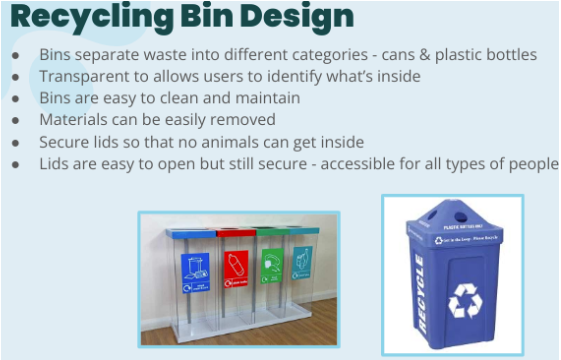 While working on our improved recycling bins, we surveyed students and made a push to encourage participation across campus. (View the images above, titled "Details for each step").